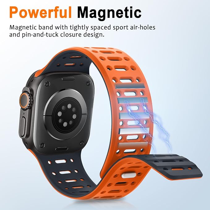 ZZDZZ コンパチブル Apple Watch バンド 49mm 46mm 45mm 44mm 42mm 41mm 40mm 38mm、シリコン通気性 スポー 磁気 交換バンド Series Ultra2/Ultra/SE2/SE 10/9/8/6/5/4/3/2/1に対応 (49mm/46mm/45mm/44mm/42mm、 オレンジ/ミッドナイトブルー)
