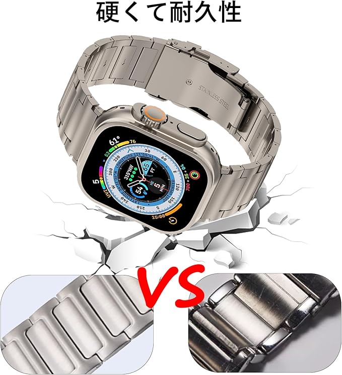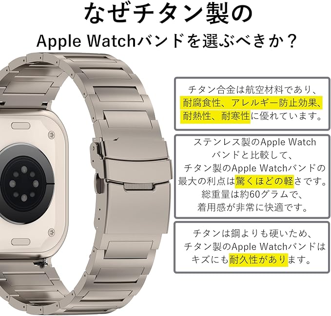 【なぜチタン製のApple Watchバンドを選ぶべきか?】チタン合金は航空材料であり、耐腐食性、アレルギー防止効果、耐熱性、耐寒性に優れています。ステンレス製のApple Watchバンドと比較して、チタン製のApple Watchバンドの最大の利点は驚くほどの軽さです。総重量は約60グラムで、着用感が非常に快適です。チタンは鋼よりも硬いため、チタン製のApple Watchバンドはキズにも耐久性があります。(素材について、バンドはチタン合金で、バックルはステンレス钢です。)