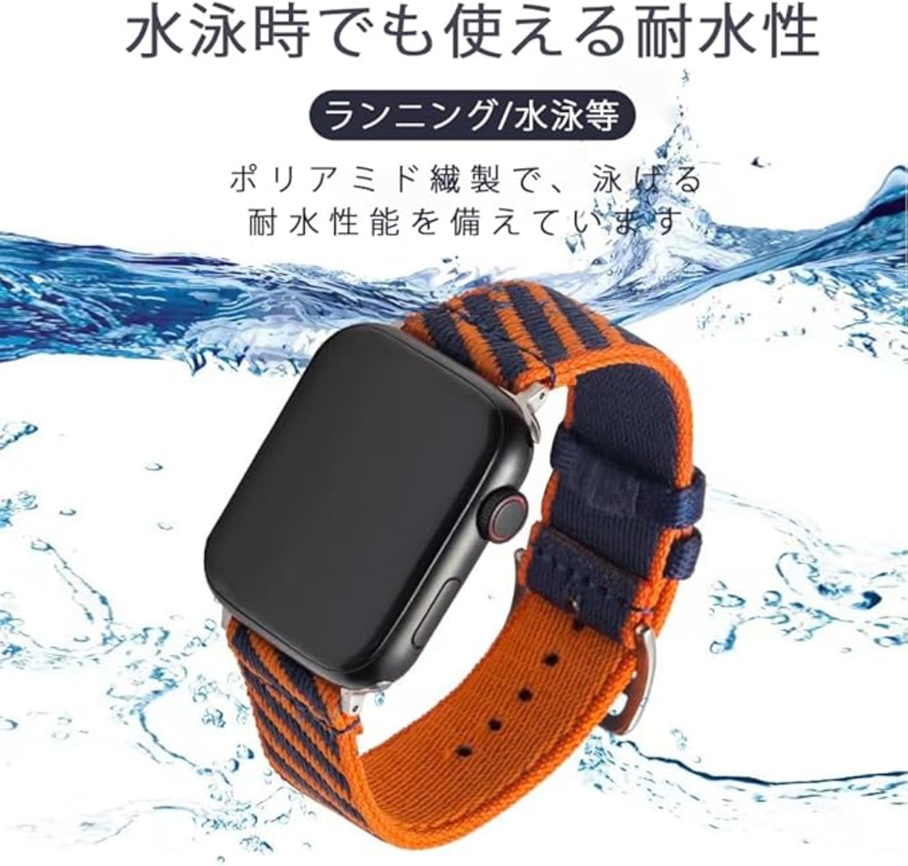 【水泳時でも使える耐水性】バンドはポリアミド繊製で、泳げる耐水性能を備えています。 耐水のアップルウォッチを、プールで泳ぐときになどでも装着可能なのです。
