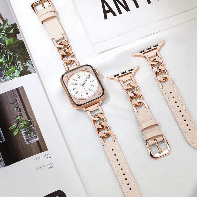 [SIBOYL] 人気細い対応アップルウォッチ バンド46mm 45mm 44mm 49mm 42mm(Series 3/2/1)、カウボーイチェーンステンレスレザあっふウォッチバンド、調整ツール不要、トレンドとクラシックの創造的な組み合わせ、互換性apple watch ベルトレディース、対応Apple Watch 11 10 Se 9 8 7 6 5 4 3 Ultra 3 2 1-ローズゴールド | KAZESHOP