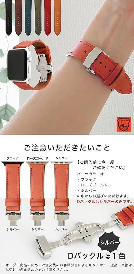 ワンタッチで着脱簡単!片手で装着でき着脱中の落下を防ぐプッシュ式Dバックル(観音開きタイプ)のApple Watch交換バンドです。自分のサイズに合わせてピンを固定しておくことで毎回装着時にピンを穴に通す必要がないため革への負担が軽減されます。栃木レザーは、伝統的なピット製法で植物タンニンなめしにこだわって製造している皮革メーカー(タンナー)です。南米産のミモザの樹皮から抽出されたタンニン剤でじっくり時間をかけてなめしあげた純正ヌメ革です。バラキズ・ムラ・ホクロ・毛穴など、革本来の表情をそのまま生かしあえて避けずに裁断をしています。その他に、チスジ・シワ(トラ)・かさぶたの痕などがあり、ひとつひとつ表情が異なります。個性の一つとしてご理解ください。ZERMATT(ツェルマット)は、世界最高峰の防水・防染性能をもつ本革です。その性能は高く評価され、ハイブランドでも使用されている皮革です。※防水・防染性能をもつ特徴がありますが、100%防止できるわけではございません。経年による防水性能の劣化等もありますので、色移りしやすいものなど、お取扱いには十分ご注意ください。