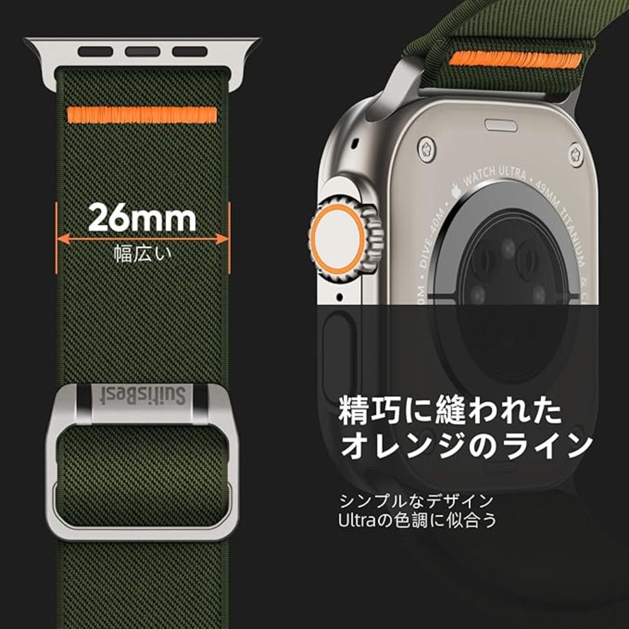 【幅広設計】男性向けの26mm幅広に仕上げたApple Watchバンドです。幅広のデザインでUltraによく似合って、腕にフィットしている安定感もあり、激しいスポーツをしてもアップルウォッチ落下の心配もないです。 Ultraの色調にも似合って、かっこいい見た目です。