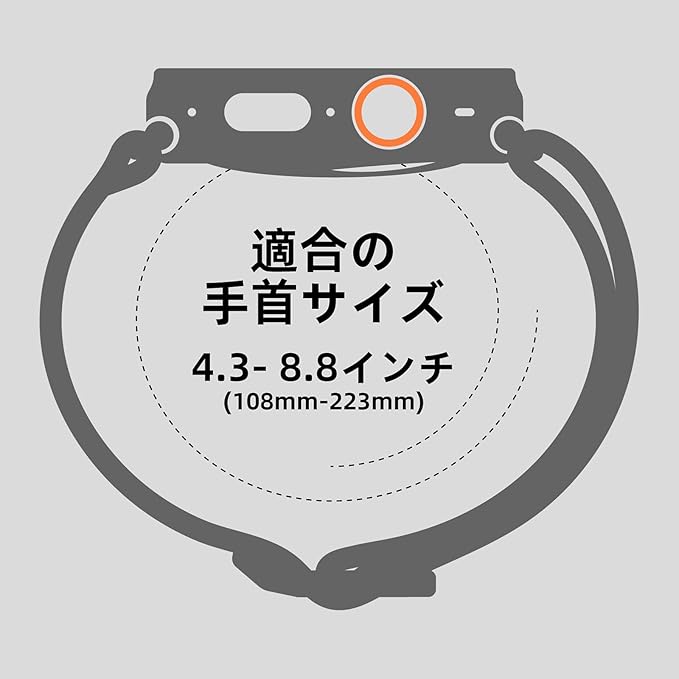 【対応機種・サイズ】このApple Watch スポーツバンドは Apple Watch Ultra2 /Ultra 49mm、Apple Watch Series SE 9 8 7 6 5 4 3の45/44/42mmに対応できます。 手首サイズは108-223mmの方に適します。長さも無段階で自由に調整可能で、どんな手首にフィットできます。