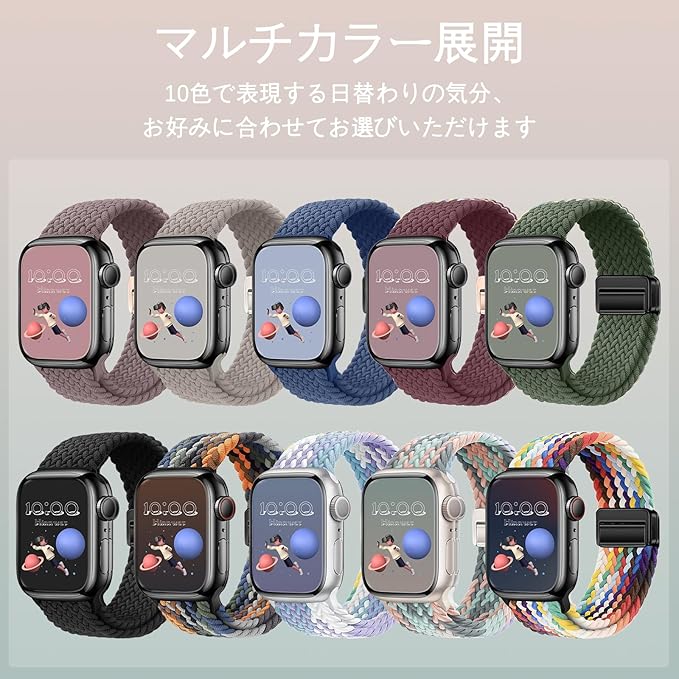 ⌚【当社の環境コンセプト】伸縮性のある編みストラップは、リサイクル可能で環境に優しい素材で作られています。各ブレスレットは高品質のナイロン繊維素材から作られており、最新の編み機を使用して精密に編まれています。このユニークなデザインは、ブレスレットの肌触りをより優しくするだけでなく、優れた耐久性、通気性、軽い質感も与え、ファッションと環境保護のコンセプトを完璧に組み合わせています。