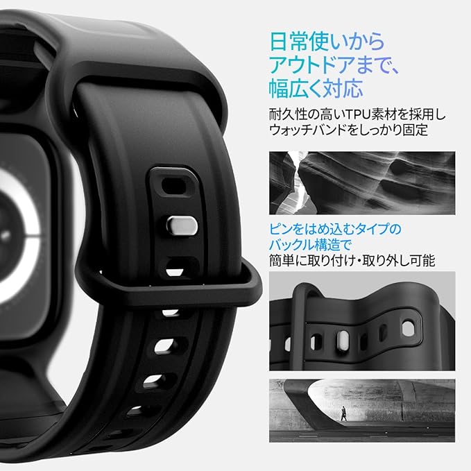 【ぴったりフィットで快適な装着感】ケースとバンドが一体化した精密設計で、Apple Watchのすべての機能を防げずスムーズに操作可能です。また、手首にしっかりフィットするため、激しい運動や日常的な動きでも安定した装着感を実現します。