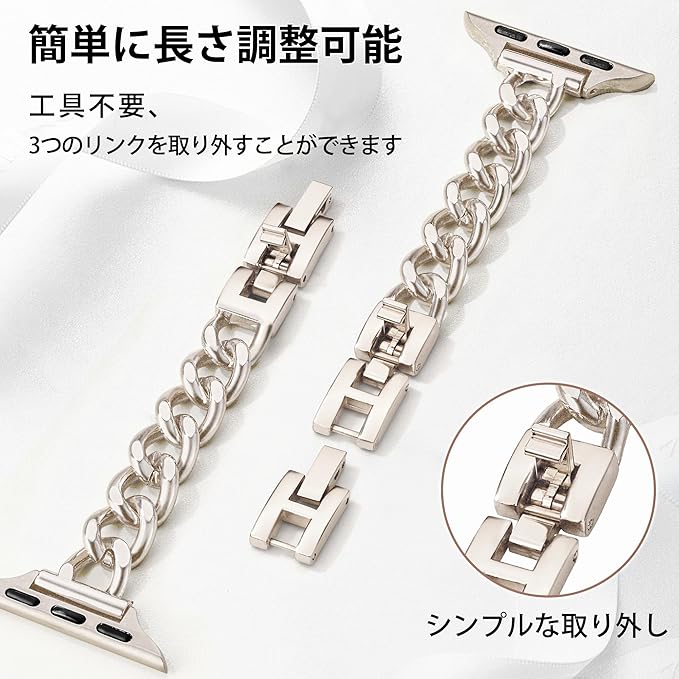 【超細シングルチェーンデザイン】エレガントな女性らしさを引き立てる超細シングルチェーンデザインのアップルウォッチ バンド。上品で通気性が高く、アップルウォッチに新しい魅力をプラスし、あなたのファッションセンスを引き立てます。