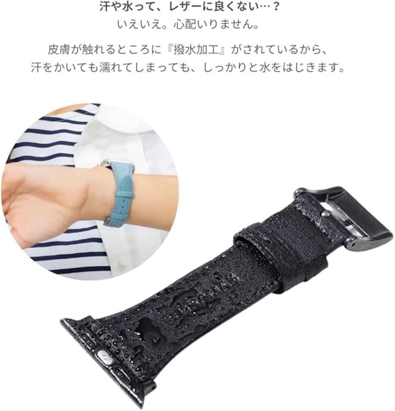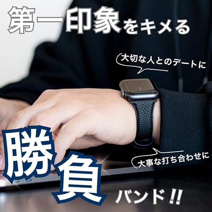 本体とのジョイント部分からバンドの中ほどにかけて、スッと細くなるデザインです。大きく見えがちなApple Watchがすっきりとした印象へ変わります。