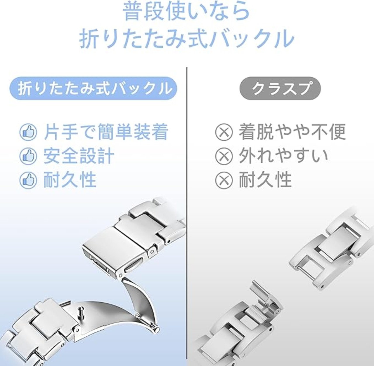 「どんなシーンにもマッチ」カジュアルにもフォーマルにも、幅広いスタイルにマッチ。オフィスでもカフェでも、ふとした瞬間に目を引きながら、決して主張しすぎない上品さを備えています。大切な人への贈り物にも最適。控えめな高級感と便利な着脱性を兼ね備えたApple Watch バンドです。