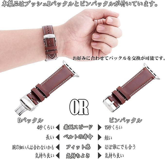 「上質な素材」本製品はアップルウォッチの交換ベルトで、高品質の天然本革、具体的にはオイルワックスレザー(Oil Wax Leather)を採用しています。それは牛革を原料として、オイルとワックスを含浸させる特殊な処理を施しています。この処理により、皮革は高い水分保持能力を備えるとともに、伸縮性と柔軟性が向上し、独特な風合いと自然な光沢を持ちます。手で触れると柔らかく、肌触りがとても良いです。長く使っても丈夫で、使い込むごとに自然に個性が出て、だんだん魅力的になります。