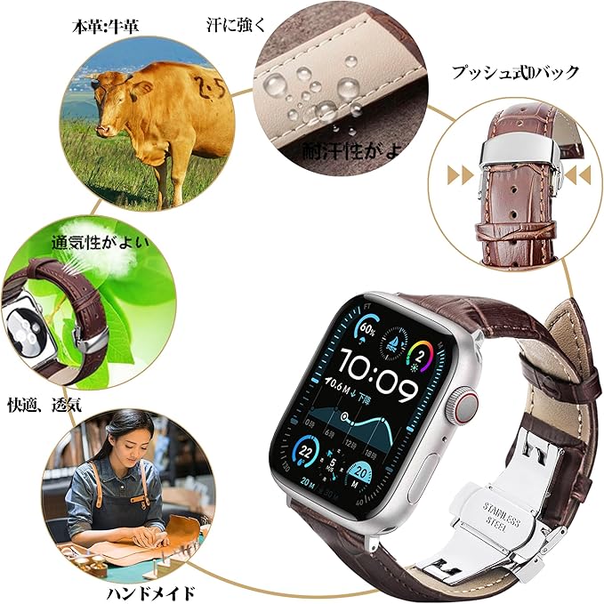 「デザインのオシャレポイント」:本製品はアップルウォッチ交換ベルトです。 高品質の天然本革を使用し、手で触れ、柔らかく滑らかで、とても快適です。 牛皮の表面に、竹の節のような模様を丁寧に圧製しています。その独特な模様は、品質とデザインを体現しており、本製品のオシャレな魅力を際立たせています。