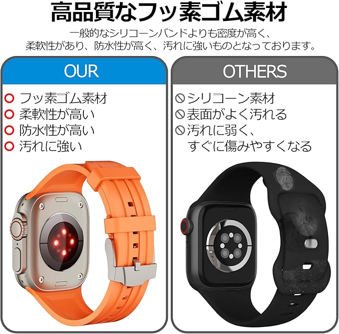 【高品質なフッ素ゴム素材】YOFITARアップルウォッチ用バンドは、希少元素のフッ素原子を導入し、一般的なシリコーンバンドよりも密度が高く、柔軟性があり、防水性が高く、汚れに強いものとなっております。一般的なシリコーンバンドの表面に付着しやすく、汚れに弱く、すぐに傷みやすくなる問題を解決しました。