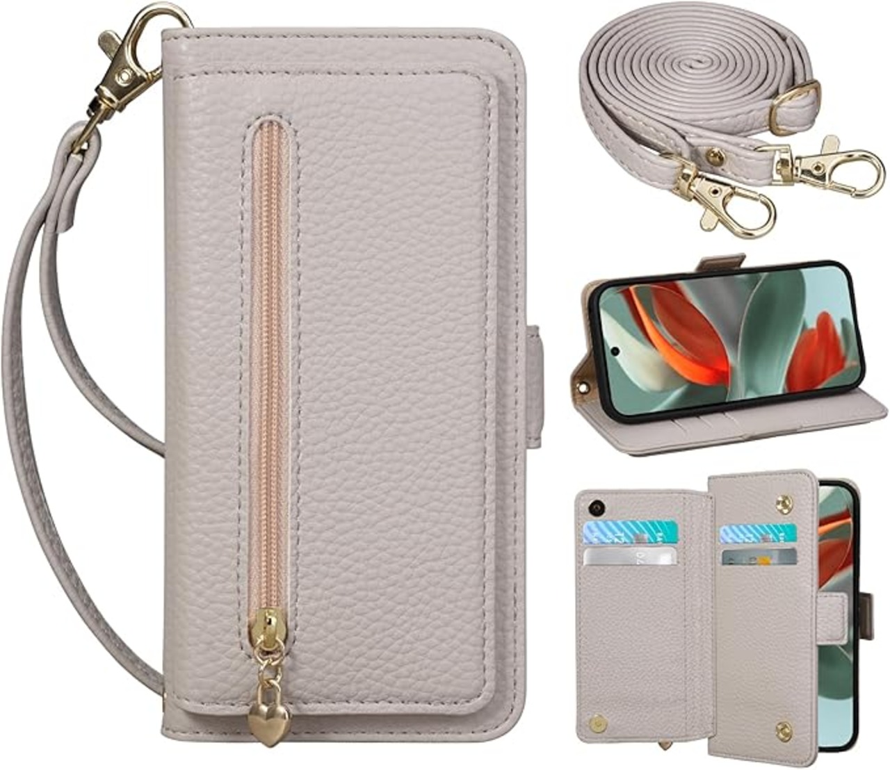 Rssviss Google Pixel 10 ケース 手帳型 Pixel 10 pro ショルダー 財布一体型 カード収納 大容量 スタンド機能 汗、指紋や擦り傷防止 手首/肩掛けストラップ付き (長さ調整可能) 小銭入れ 全面保護 レザー グレー | KAZESHOP