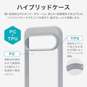 【ハイブリッドケース】硬く透明度の高いPC(ポリカーボネート)と、柔らかく耐衝撃性があるTPUのハイブリッドケースです。2つの素材で端末をしっかり保護します。【耐傷・耐衝撃】ケース背面は硬く透明度の高いPC(ポリカーボネート)です。傷に強く、黄変しにくい素材です。側面は柔軟性があるTPU素材で、四隅にはエアクッションを搭載。落下時に多い角への衝撃に備えます。【持ちやすく、使いやすい】側面のTPUはグリップ感に優れ、持ちやすく落下防止に繋がります。万が一の落下時に備え、四隅にはエアクッションを搭載。【精密設計】カメラレンズ周囲を高く設計することでレンズを保護。ボタン周囲までカバーする精密設計で、細かな傷やホコリから守ります。【もっと便利に】ケース側面下部にはストラップホールを搭載。松葉紐タイプのストラップを装着できます。更にケースを装着したままケーブル充電が可能です。※全て充電ケーブルの動作を保証するものではありません。