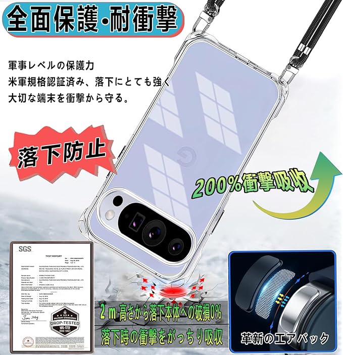 【耐衝撃 & 米軍MIL規格の取得 & ストラップホール付き】その耐衝撃性能は第三者機関の試験による米軍MIL規格をクリアするほど高いことが証明されております。グーグルピクセル pixel10/10プロ ケースの四隅部分に"衝撃吸収テクノロジー"を採用し、これにより角からの衝撃を受けてもその隙間がクッションの様に本体への衝撃を吸収します。万が一スマホを落としてしまった場合でも、落下時のダメージを最小限に抑えることが可能となっており。バンパーはしなやかな感触で手に吸い付くので滑り難しく、落下の防止に大きく貢献できるので安心!