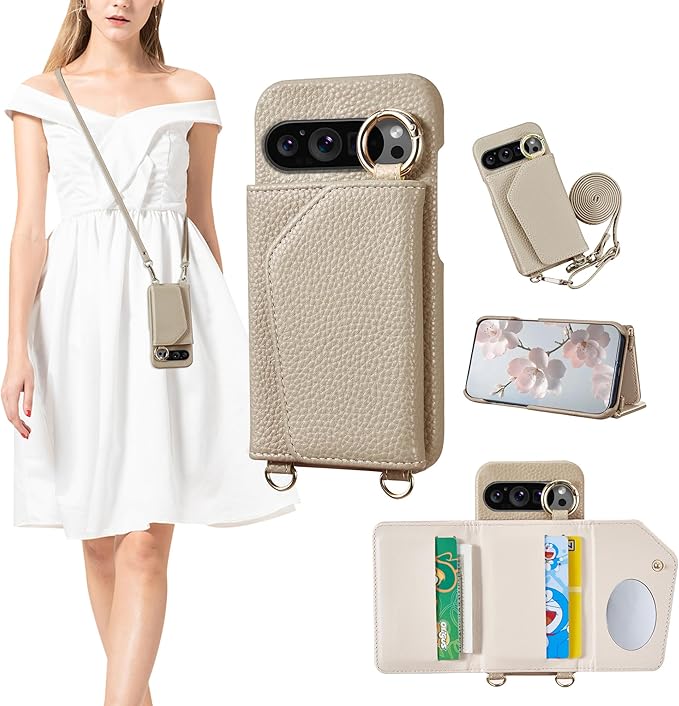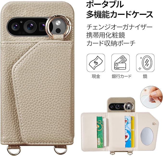 Pixel 10 ケース 手帳型 Pixel 10 Pro 財布型 ショルダー ぐーくるぴくせる10の手帳型ケース googleピクセル10/10pro 携帯カバー レザー 背面カード 肩掛け 斜め掛け 小銭 可愛い 耐衝撃 化粧鏡付き カード収納 取り外[アーモンドブラウン] | KAZESHOP