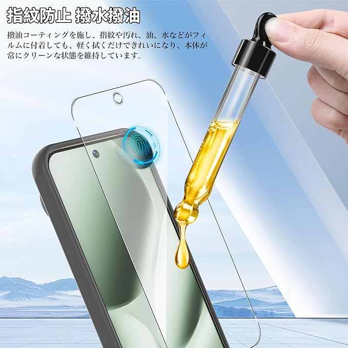 【汚れに強い】撥水・撥油加工が指紋や皮脂の付着を防ぎます。フィルムの表面には様々な特殊加工が施されており、油分、ほこり、指紋に強く、スマートフォンを常に清潔な状態に保ち、見た目の美しさや画面体験にも影響を与えません。頻繁にスマホを拭かないようにします。