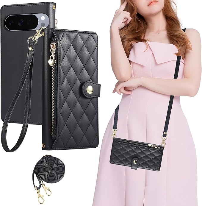 Gedurya Google Pixel 10 Pro XL 用 ケース 手帳型 ショルダー グーグル ピクセル10pro xl ケース ショルダー ファスナー型 小銭入れ 斜めがけ 肩掛け ピクセル10proxl スマホケース 財布型 カード収納 コインポケット Pixel10プロ XL 手帳型 携帯カバー マグネット開閉式 スタンド機能 同色ストラップ付き ロング+ショート - ブラック | KAZESHOP
