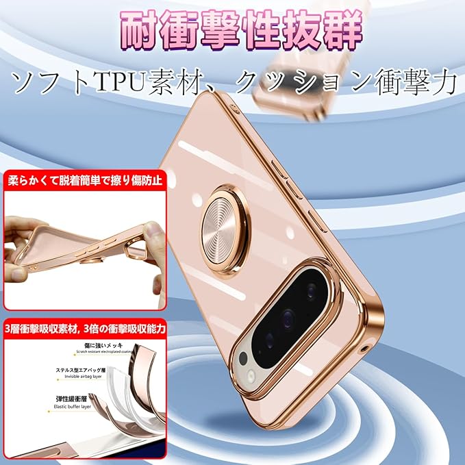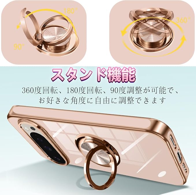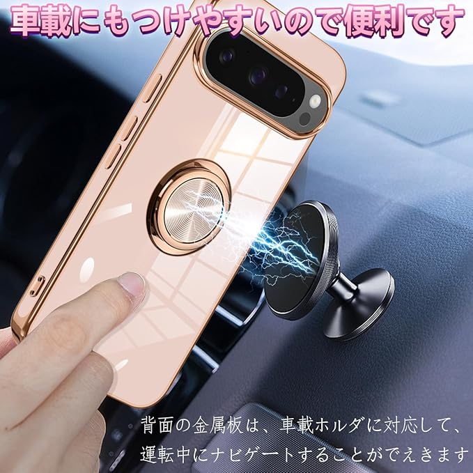 Google Pixel 10/10 Pro ケース リング ピクセル10/10 Pro カバー リング付き 耐衝撃 人気 米軍MIL規格 メタリックな質感 TPU 軽量 携帯カバー スタンド機能 車載ホルダー対応 360 回転 指紋防止 (ピンク) | KAZESHOP