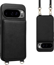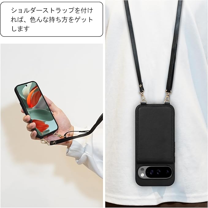 Shlybaay Pixel 10 ケース 手帳型 背面 カードケース Pixel 10 pro 手帳型ケース ショルダー ストラップ 背面ケース ピクセル 10 用 肩掛け カード収納 斜め掛け スタンド マグネット PUレザー D5N ブラック