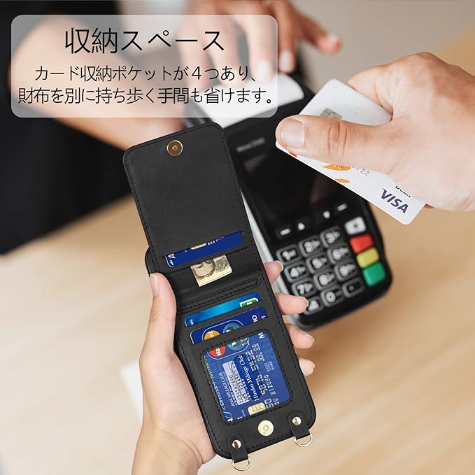 【安心感あり】ケースには下に二つのストラップホール、上に一つのリングが配備して、ショルダーストラップは調節可能なデザインが施され、お客様の一番快適な長さを自由に調節でき、ケースは落としづらく、紛失防止にも最適、スマホを片手操作できます。2箇所で吊るすので安定感もあり、使わない時にも安心で胸の前に置けばいいです。両手が自由になって、携帯を無くす心配もいらないです!カメラ部分もより高く設計で落としてもカメラレンズを保護できます、お客様にいっぱいの安心感を与えます。