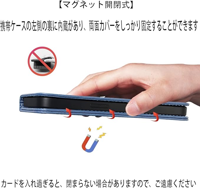 【カードポケット付き】:財布型ケースとして、名刺やお札などを入れるカードポケットがつき、ちょっとしたお出かけにもスマホケース一つでOK!日常生活に便利です。ただし、カードを入れ過ぎると、閉まらない場合がありますので、ご遠慮ください。