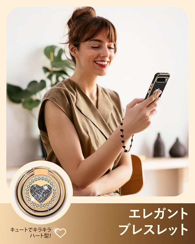 Rockaway Pixel 10 用 ケース ダブルリング付き リストバンド ブレスレット付き ストラップ 耐衝撃 薄型 軽量 紐付き キラキラ ラブハート かわいい 女の子 おしゃれ 豪華 スマホケース ピクセル10 カバー - ブラック | KAZESHOP