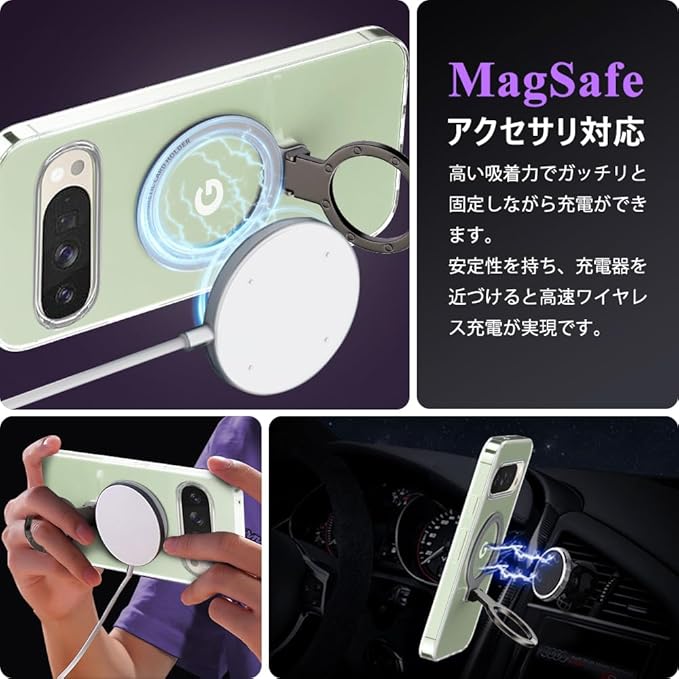 【MagSafe対応】隠しスタンドと強力なマグネットリングの強力な結合により、高い吸着力でガッチリと固定しながら充電ができます。安定性を持ち、充電器を近づけると高速ワイヤレス充電が実現です。