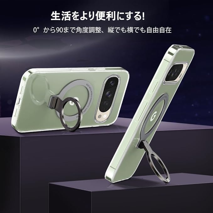 【スタンド機能】多機能スタンドとリング一体型の斬新なデザインです。隠しスタンドの設計で、省スペース性に優れ、収納するときは水平的に置けできて、持ち運びの邪魔になりません。縦置きでも横置きでも安定して支えられ。FaceTimeでも動画でも両手が完全に解放されます。また、安定したアルミ合金製の円形スタンドを採用しており、携帯性からもファッション性からも唯一無二の存在です。