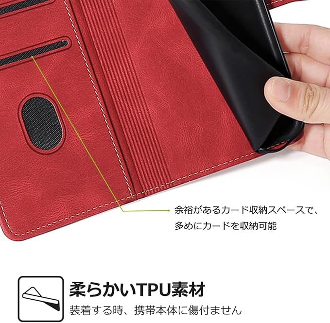 高品質なTPUとPUを利用することで良い手触りと耐衝撃性を実現 ●本体を固定するカバーはTPU素材のソフトケースなので脱着が簡単。ポリカーボネートの固い素材ではないので、脱着時に本体を傷つける心配がなく、落下時にカバーが破損することも無いので安心してご利用いただけます。●レザーのカバーはTPUケースよりも少し大きめに設計されており、どのような落下でも、衝撃が直接スマートフォンに伝わらないので安心です。●外部は上質なPU革素材を採用、傷や汚れが目立ちにくく長く使え、放熱性にも優れています。