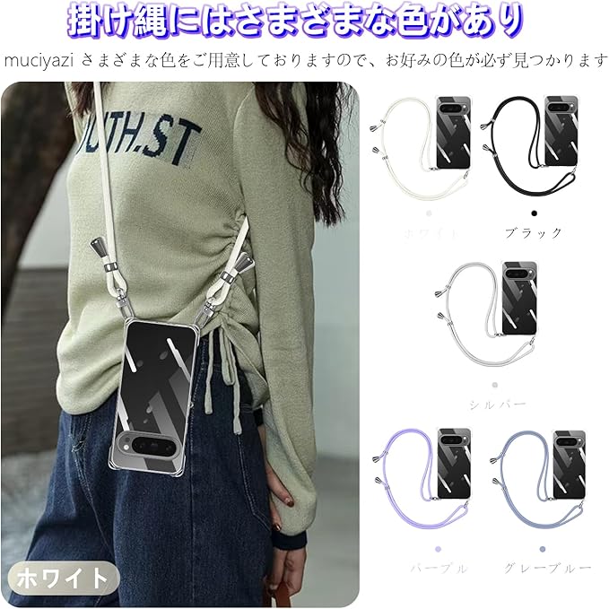 Google Pixel 10/Pixel 10 Pro 用 ケース クリア ショルダー ピクセル10 カバー 肩掛け 斜めかけ 縄掛けケース 透明 薄型 軽量 TPU 携帯ケース 紐付き 織りストラップ付き 長さ調整可能 取り外し可能 落下防止 紛失防止(ホワイト) | KAZESHOP