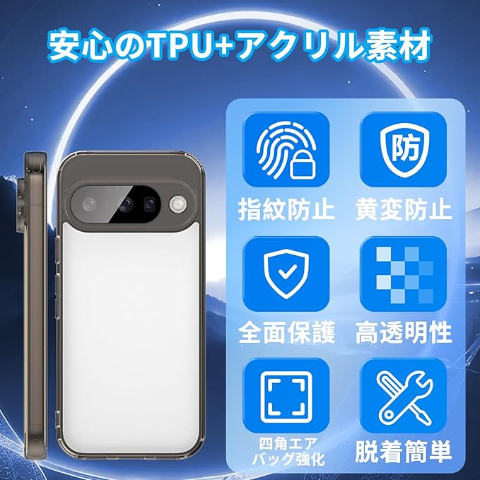 [5D全透明バックプレート]TPU透明ケースは99%の透過率を実現し、Google Pixel 10の美しいボディデザインを忠実に再現。航空機級の黄変防止素材を採用し、特殊コーティング処理を施しているため、紫外線・汗・経年劣化による変色や黄ばみを防止。長期間使用しても透明で美しい状態を保ちます。