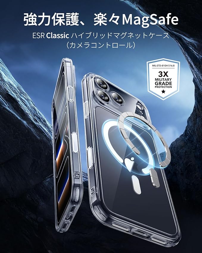 【軍用規格の保護性能】 ESR いphone17Pro ケースのClassicハイブリッドケースは軍用基準で厳密にテスト済みです。エアガードコーナーが衝撃を吸収し、iPhone 17 Proを傷や落下からしっかり守ります