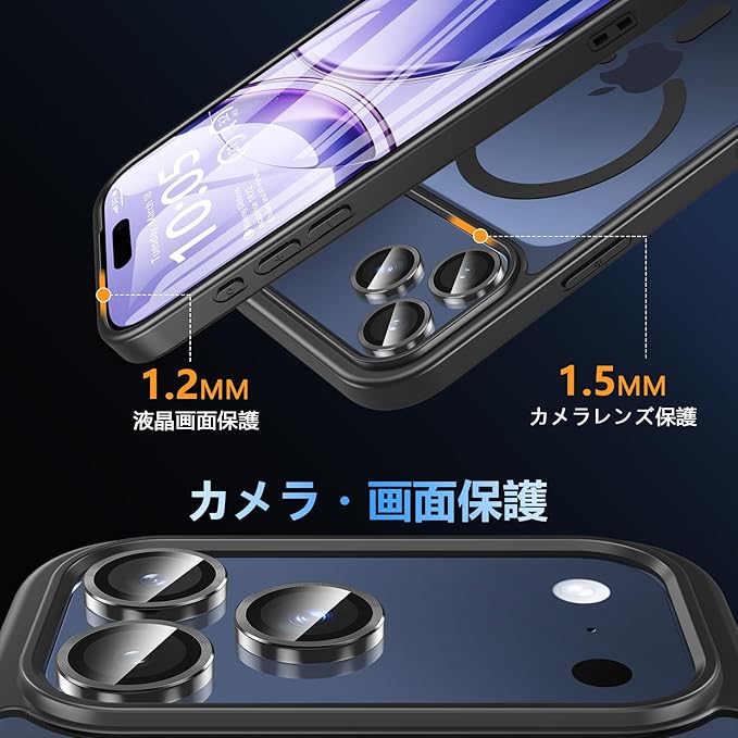 【抜群な耐衝撃性&全面保護】頑丈なPC背面と柔軟なTPUフレームを採用し、四隅にエアクッションを配置したデザインで、防塵、防傷、衝撃吸収に優れ、日常使用に対する確かな保護を提供する いphone17pro ケース です。また、液晶画面より1.2 mm、カメラレンズより1.5 mm高い高低差設計を採用し、スマートフォン本体を徹底的に守ります。平面に置いてもうっかり落としてもスマートフォンを保護できる iPhone 17 Pro ケース です。