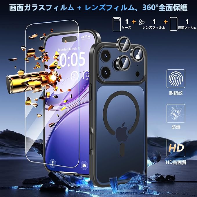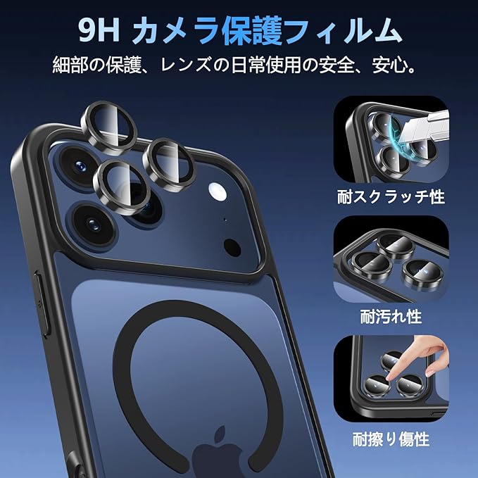 iPhone 17 Pro ケース [ガラスフィルム・カメラレンズカバー・MagSafe対応] いphone17pro ケース Hensinple 半透明 薄型 軽量 カメラ保護 全面保護 耐衝撃 アイフォン17プロカバー 指紋防止 マグネット搭載 マグセーフ対応 ストラップホール付き iPhone 17 Pro スマホケース 6.3インチ用 ブラック | KAZESHOP