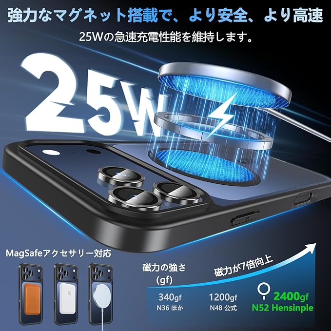 【強力な磁力搭載&MagSafe対応】内蔵された強力なマグネットでピッタリと密着し、MagSafeに対応した全ての機能と完全に互換性があります。 iPhone 17 Pro ケース を外すことなく、MagSafe充電器、MagSafeバッテリー、MagSafe車載ホルダー、MagSafeリングなど、全てのMagSafeアクセサリーを使用できます。より簡単で、より高速で、日常生活に便利な いphone17pro ケース です。