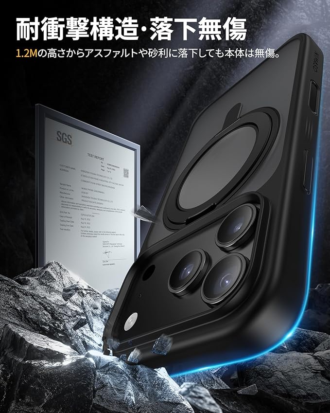 【四隅のエアバッグ保護 ・耐衝撃性抜群】背面はPC(ポリカーボネート)、側面はTPU(熱可塑性ポリウレタン)素材で設計され、落下時に衝撃からiPhoneを守ります。ケースのコーナー部分にはエアバッグが設計され、高い耐衝撃性を持ち、あらゆる方向からiPhoneを保護します。ケースの縁は、スクリーンから1.0mm、カメラレンズから1.2mmの高低差を出すことで、テーブルに置いても画面やカメラレンズに接触することなく、摩擦などからiPhoneをしっかり守ります。