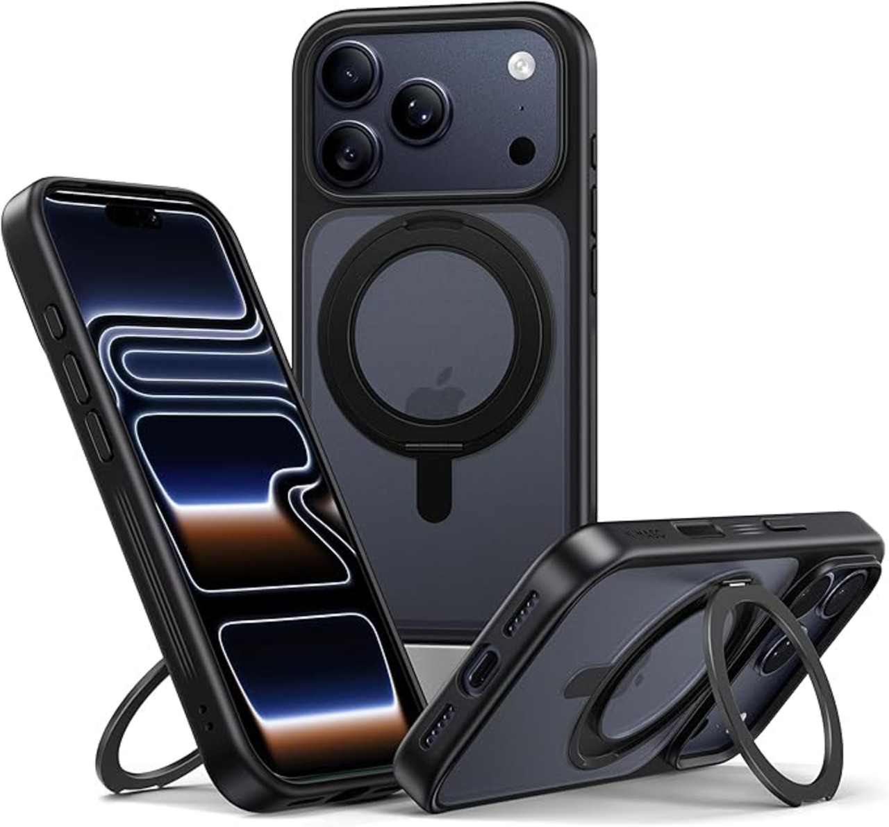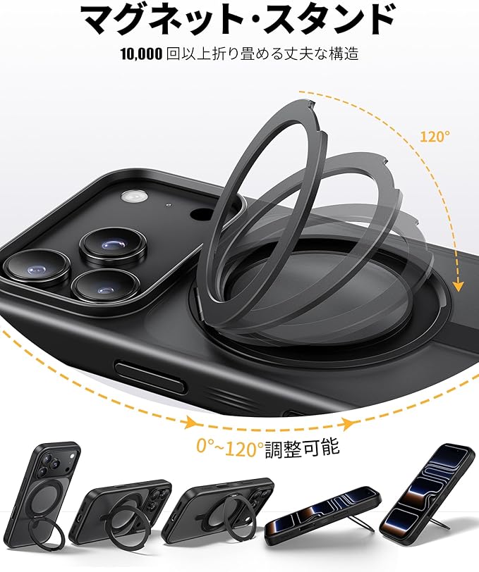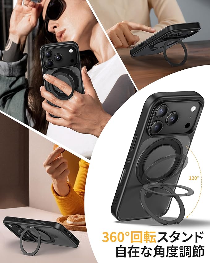 NIMASO iPhone 17 Pro 用 ケース 縦横両対応 360 回転スタンドケース いphone17pro 用 MagSafeアクセサリー対応 カメラコントロールカバー 携帯スマホケース リングマグネット ワイヤレス充電対応 半透明 防指紋 米軍MIL規格 耐衝撃性 ストラップホール付き アイフォン17 プロ 用 アジャスタブルスタンド ブラック(黒羽シリーズ)NSC25F1667 | KAZESHOP