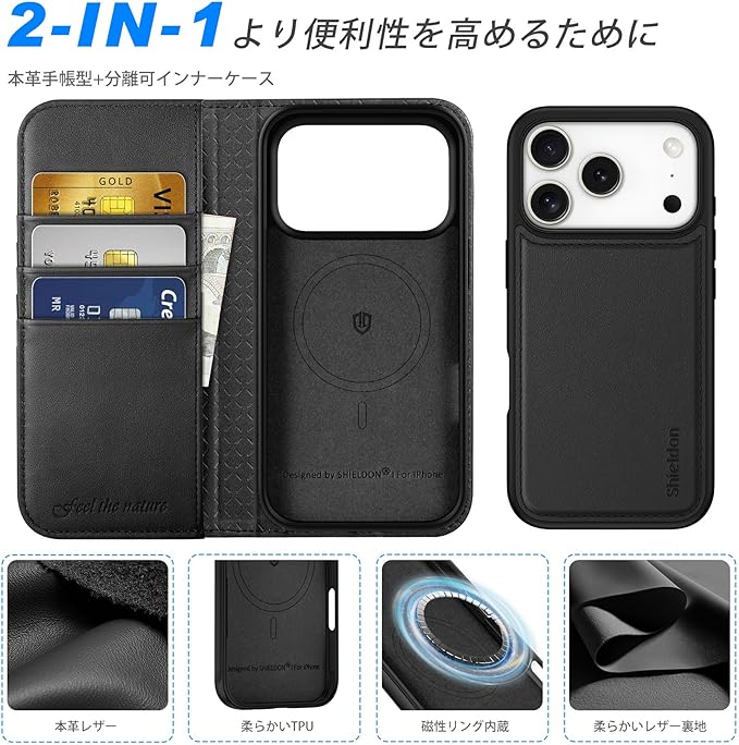 SHIELDON iPhone 17Pro 対応 手帳型ケース 2in1分離式 本革レザー 6.3インチ 5G カード収納 [RFIDブロッキング] 取り外し自由 カバー単体ワイヤレス充電可 横置きスタンド機能 ストラップ穴付き 衝撃吸収 アイホン17プロ 対応 スマホケース 2025年発売 2-in-1分離式 ブラック | KAZESHOP