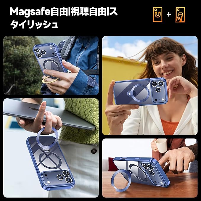 【360 回転!|耐久性・安定性・高級感全て揃えた】 市販品にありがちな「変形」、「緩み」、「安定性がない」などの悩みを、新しい製品にフィードバックして全ての問題を解消した!このiphone 17 pro ケース独自の技術を搭載し、10 万回以上の耐久テストをクリア。材質・形状・加工技術に徹底的にこだわり、市販品に比べて約10倍の圧倒的な耐久性と強度を実現したことにより、リングの部分緩みや破損も一気に解消!このiphone 17 proケースは縦 45  直立から横 180  まで角度自在に調節できる。市販のスタンドが横置きを調整できず欠点を完全に解消しました!動画再生やビデオ通話などで、自分好みの角度に簡単に設定できます。カフェで集中作業する際、60  傾けて iPhone を立てると、レポート作成中でもスマホでメール確認が両立。