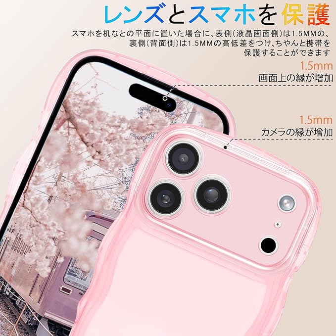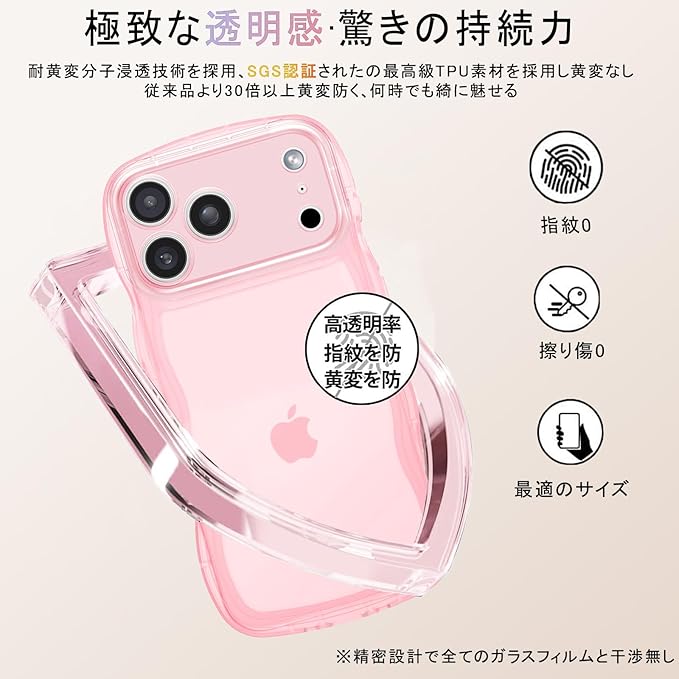 【かわいい波枠】これはiPhone 17 Pro ケース用のクリアユニークな境界デザインで。かわいい波状のボーダーが指にフィットし、摩擦が高まります。透明度が高く、黄変防止を実現しました、スマホ本体の美しさを完璧に見せる、携帯電話をよりファッショナブルで目を引くようにします。ファッションと実用性の完璧な組み合わせ。柔らかTPU素材なので着脱簡単です。 「ご注意:背面には写真などを入ることができる、厚みのあるアクリルスタンドは入りません。」