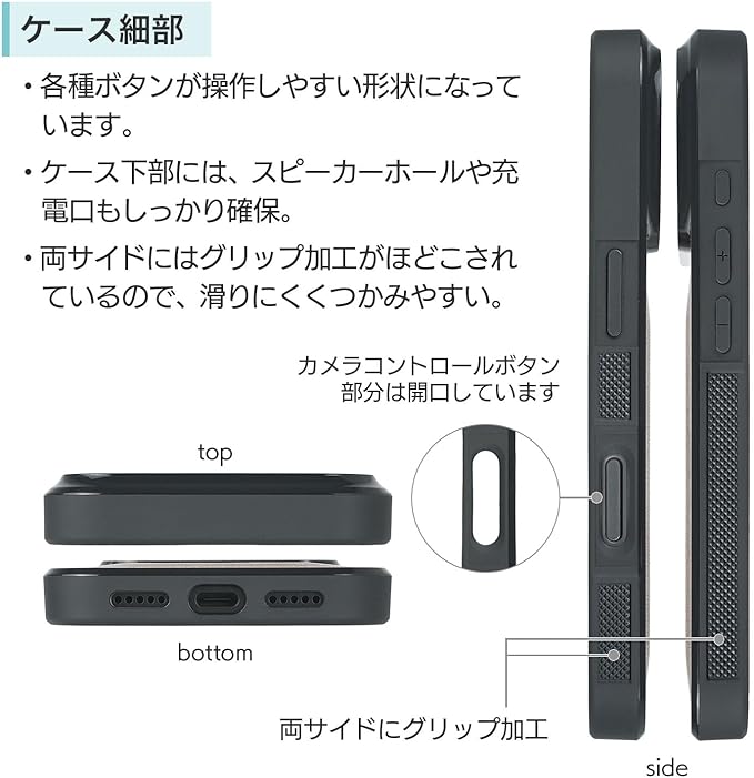 ・ ケースの両サイドにはグリップ加工が施されているので、すべりにくくしっかりと掴むことができます。