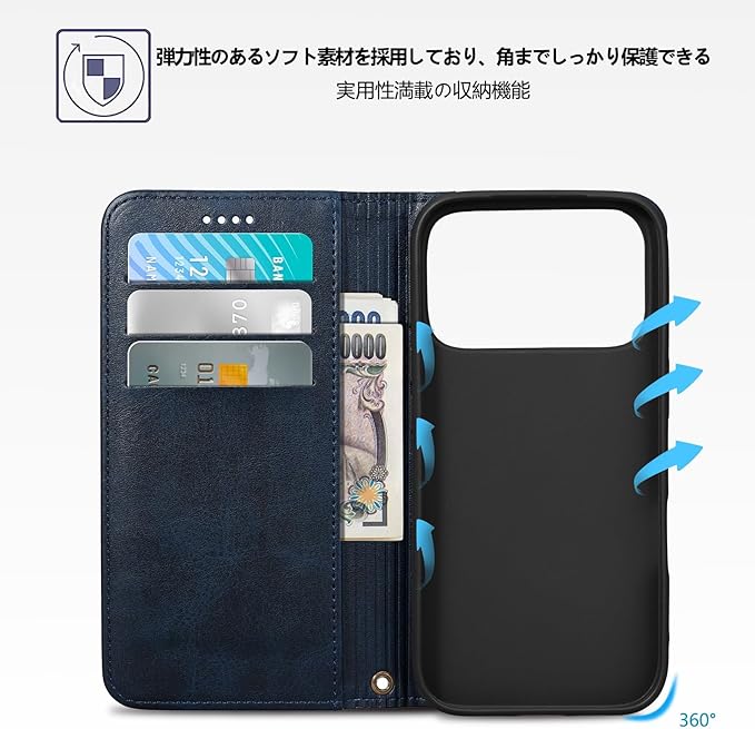 「iPhone17 Pro 専用手帳型ケース」:カバーは高級なPUレザーを採用しており、放熱性や耐衝撃が良く、傷や埃を防ぐことができるiPhone17Proカバーです。インナーケースはソフトタイプなので、スマホの着脱が簡単ですし、角までしっかり保護できるiPhone17Proケースです。