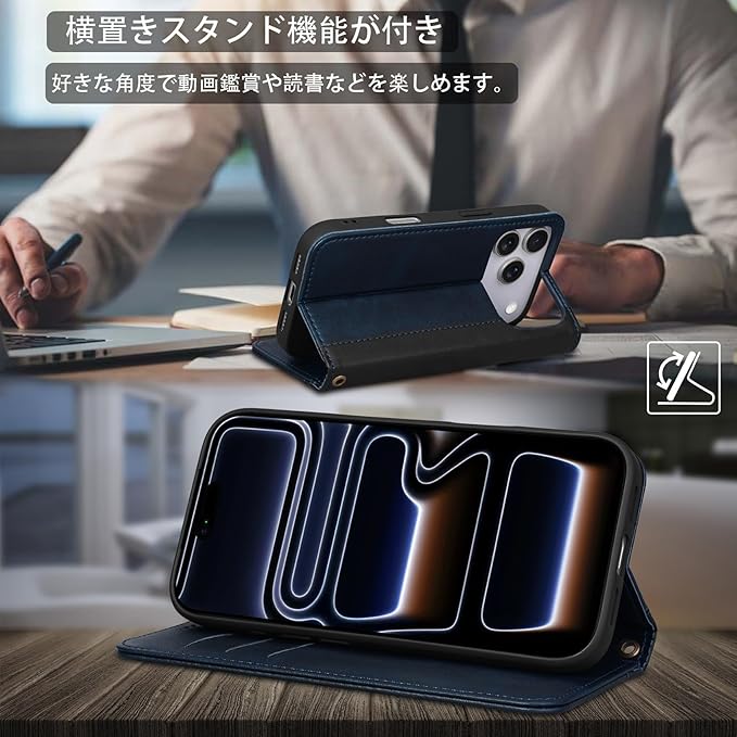 Rssviss iPhone 17 Pro 用 ケース 手帳型 iPhone 17Pro スマホケース カード収納 スタンド機能 アイフォン17 Pro 用 ケース 内蔵マグネット ベルトなし 耐衝撃 保護 ダークブルー | KAZESHOP
