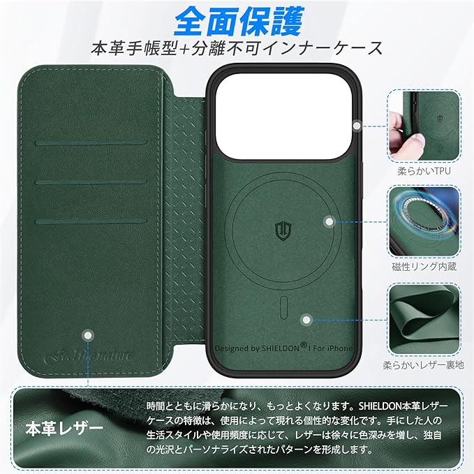 SHIELDON iPhone17Pro 対応 手帳型ケース 本革レザー 6.3インチ 5G 薄型 ワイヤレス充電 磁気充電可 カード収納 [RFIDブロッキング] マグネット内蔵 ストラップ穴付き 衝撃吸収 アイホン 17プロ対応 スマホケース 2025年発売 ミッドナイトグリーン | KAZESHOP