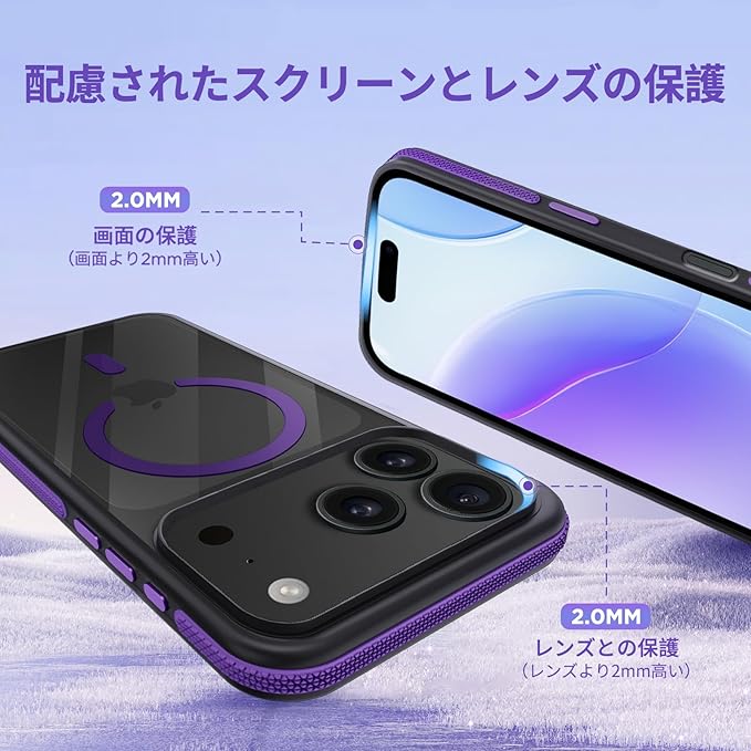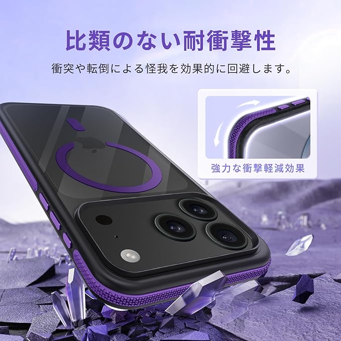 fagazzfu 対応 iPhone 17 Pro ケース MagSafe対応 耐衝撃 半透明 【滑り止めと衝突防止のツーインワンエッジ】 対応 iPhone 17 Pro スマホケース 衝撃吸収 滑り止め 傷防止の いpほね17Pro カバー ワイヤレス充電対応 米軍MIL規格 衝突防止ストリップフレーム レンズ保護 薄くて 人気 (パープル) | KAZESHOP