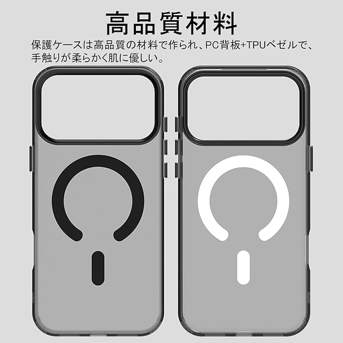 高品質素材&衝撃吸収:iPhone 17 Pro保護ケースの本体部分には高品質PC素材を採用し、肌触りも快適です。フレームはソフトなTPU素材を採用し、取り付けが容易です。本机より高い保護ケースのレンズとスクリーン、および保護ケースの四角な微気囊の設計はすべて効果的に日常の擦れや不慮の落下を防ぎます。