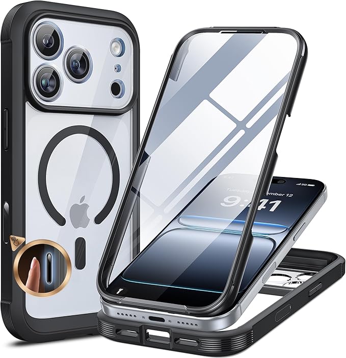 Miracase iPhone17pro ケース MagSafe対応 スマホケース いPhone17pro 用 カバー 9H 強化ガラス 360 保護 全身バンパー保護ケース 6.3インチ フルカバー ワイヤレス充電対応 マグセーフ対応 マグネット搭載 黒 | KAZESHOP