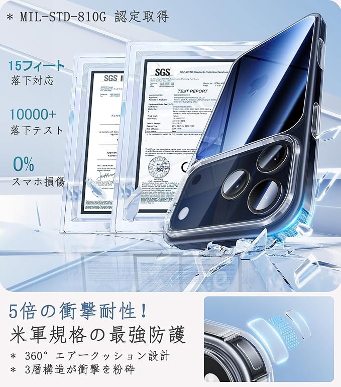 【MIL規格認証-いphone 17 pro ケース全面防護】本製品は、MIL-STD-810G 認証を取得した耐衝撃設計を採用。強化された衝撃吸収構造により、米軍規格をクリアした強固な保護性能を実現しました。JIS規格に基づく試験環境において、高さ3.85mからの衝撃に耐える信頼性を証明しています。TPUとPCの3層緩衝構造と強化プロテクションコーナー、画面周り1.5mm/カメラ周り2mmの立ち上がり設計が、99%以上の衝撃エネルギーを吸収。あなたのiPhone 17 proを確実に守ります。