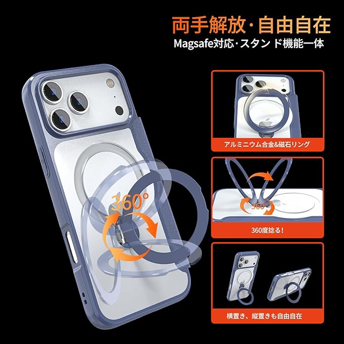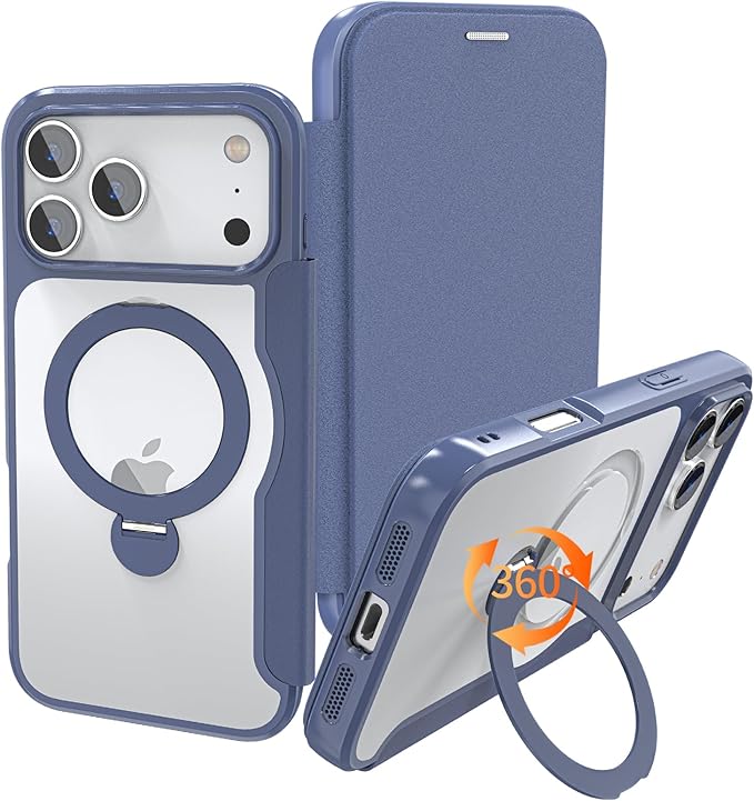 【実用性が高い手帳型】 iPhone 17 Pro 用 ケース 手帳型 2枚カード収納 背面クリア 360度回転するMagSafeリングが超便利 軽い 薄型 耐衝撃 全面保護 縦横両対応 レザー素材 おしゃれ 青 | KAZESHOP