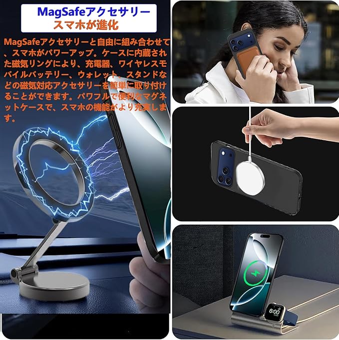 【強力な磁力吸着・高速充電体験】強力なマグネット搭載で差し込みのいらない超簡単充電を実現しました。マグネットによる正確な位置合わせで、ワイヤレス充電がこれまでよりもすばやく簡単に完了します。iPhoneを充電する時は、ケースを装着したままMagSafe充電器に取り付けるか、Qi規格の充電器の上に置くだけです。